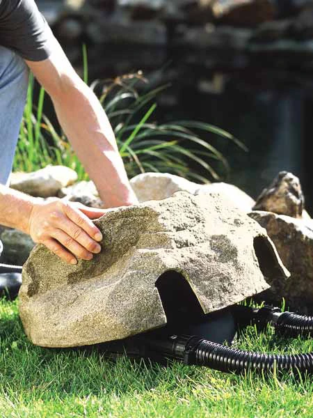 Die witterungsbeständige Abdeckung (57 x 57 x 32 cm) aus hochwertigem, stabilem Kunststoff in attraktivem, sandstein-Felsdekor schützt die Anschlüsse im Deckelbereich des Filters und passt sich durch die natürliche Oberflächengestaltung harmonisch in die Teich- bzw. Gartenlandschaft ein.