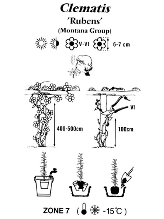 | Besonderheiten, Pflege: | Keine Staunässe, bei der Pflanzung den Ballen eine Handbreit unter die Erdoberfläche setzen, anspruchslos, robust und gesund. Rückschnitt: siehe Pflanzung und Pflege von Clemtais |