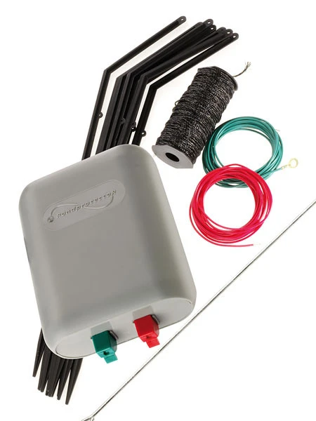 Der Pond Protector wird einschließlich Transformator, 10 Kunststoff Ständern, 80 m Abschreckdraht, Verbinder und einer Gebrauchsanweisung geliefert. Die 80 Meter Draht reichen aus um 40 m Teichrand mit zwei Drähten zu umspannen.