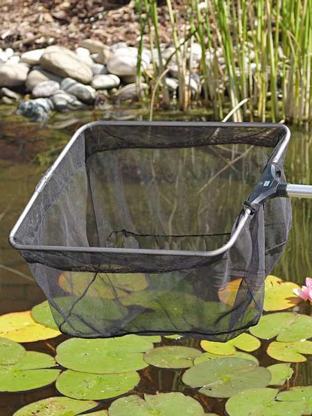 Schnell zur Hand ist der trapezförmige, 40 x 30 cm OASE Profi-Teichkescher mit engmaschiger Gase. Er ermöglicht dem Teichfreund, trockenen Fußes und sicher vom Ufer aus alles zu entfernen, was im Wasserparadies unerwünscht ist. Für eine besonders große Reichweite sorgt der praktische 113 cm lange Teleskopstiel aus eloxiertem Aluminium, der sich bis auf 190 cm Länge ausziehen lässt.
